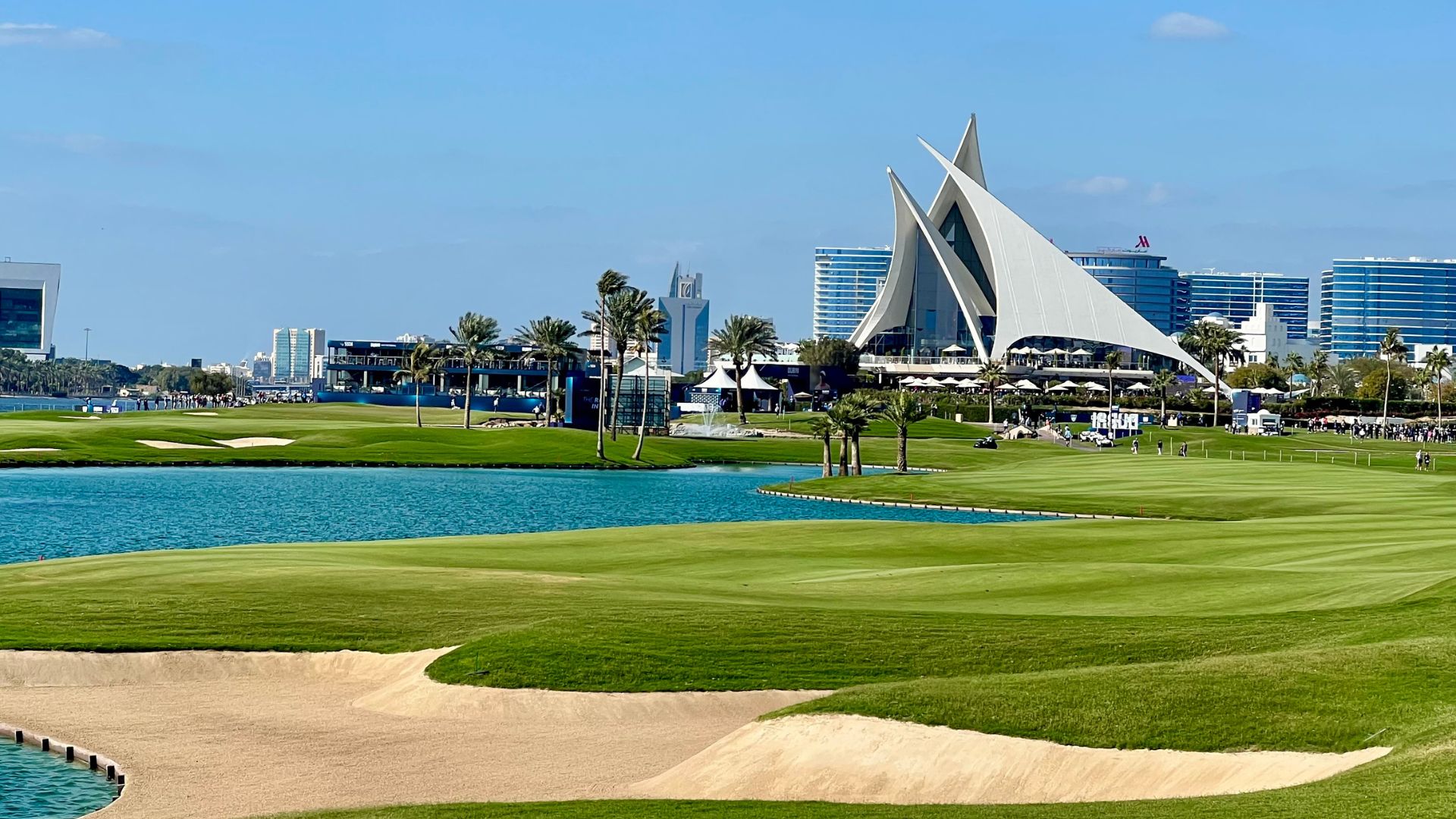 The Dubai skyline frames the fairways like a modern cathedral. The glass and concrete clubhouse with its seven Bedouin tent-like structures combines tradition and modernity.